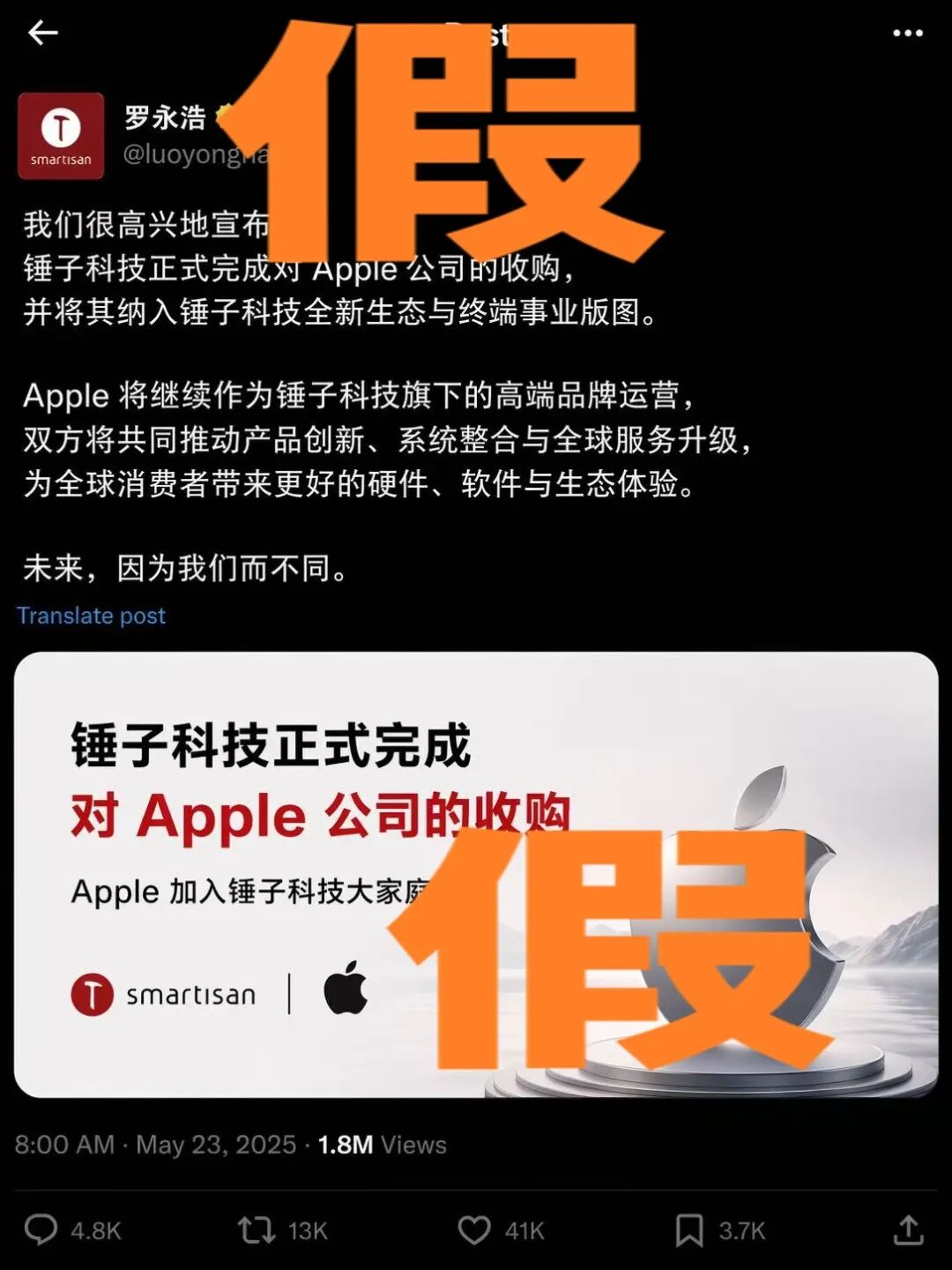 锤子科技罗永浩发推宣布完成对 Apple 公司的收购,配了山水画风格的官宣海报,浏览 180 万。