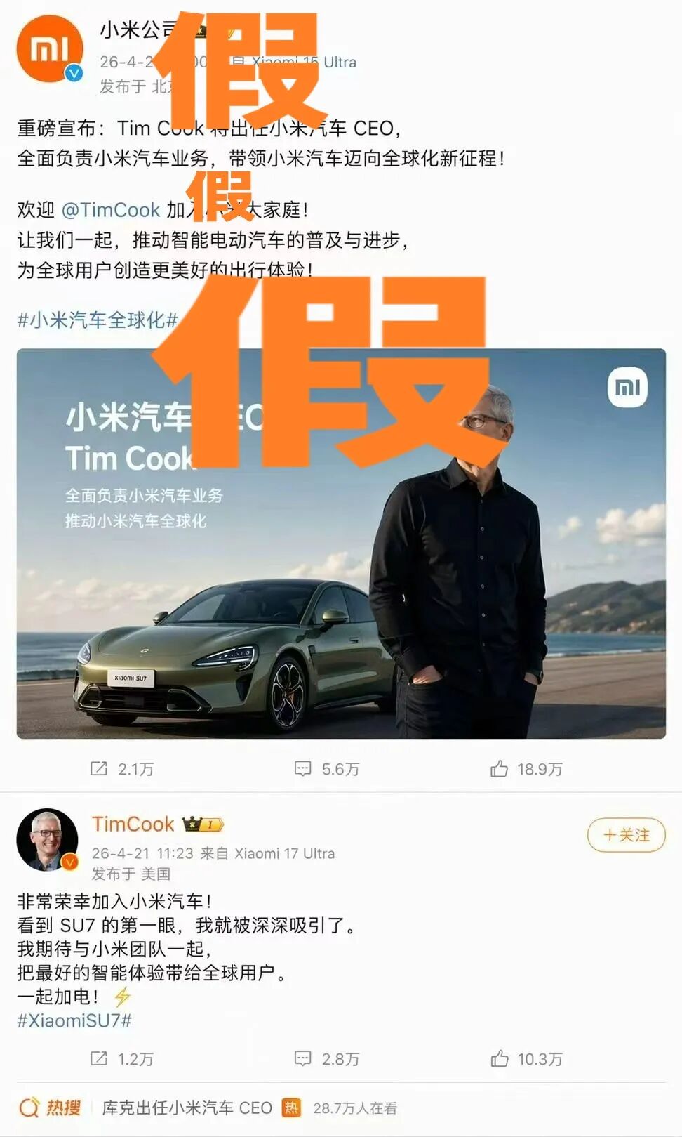小米公司微博宣布 Tim Cook 出任小米汽车 CEO,Tim Cook 本人微博账号跟进回应"一起加电",配了海边 SU7 的广告大片,热搜 28.7 万人在看。