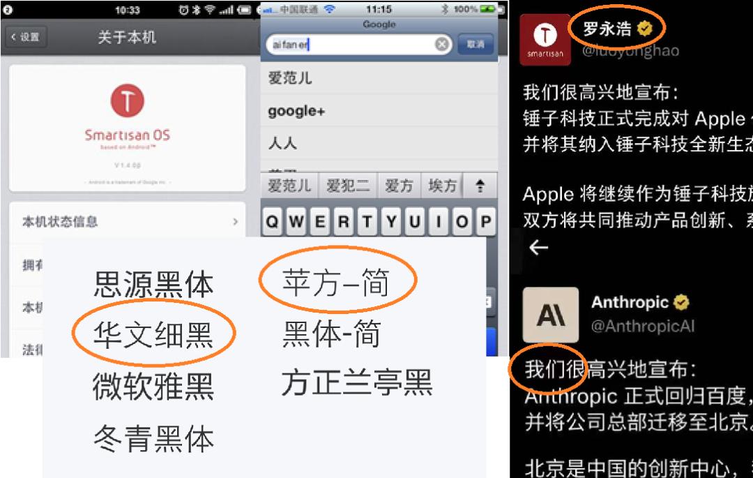 让我们回到上文的图片区域,找到“罗永浩推文”和其它 X 推文截图对比。实际上,“罗永浩推文”使用了锤子手机默认的华文黑体作为字体;在另一张 X 推文中,使用的却是苹方。