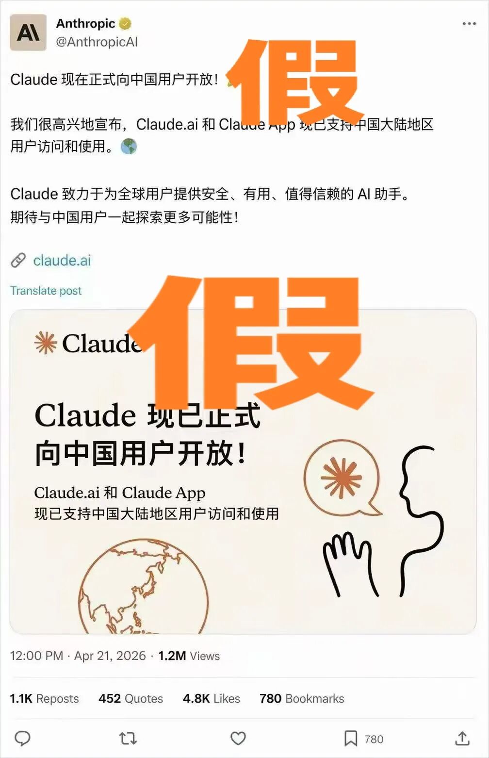 Anthropic 官方账号宣布 Claude 正式向中国用户开放,配了精心设计的宣传海报,浏览 120 万。