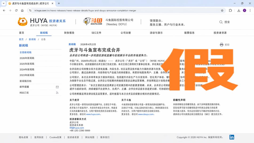 虎牙与斗鱼的公司投资者关系页面发布了合并完成的新闻稿,页面布局、子导航、前瞻性声明、投资者联系方式一应俱全。