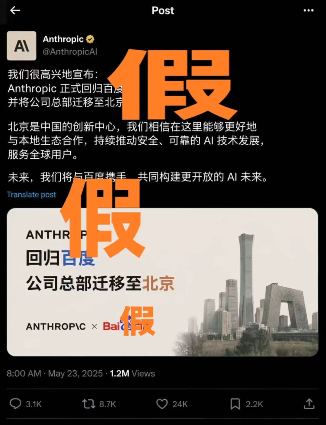 Anthropic 推文宣布回归百度,总部迁至北京,配了北京天际线的海报。