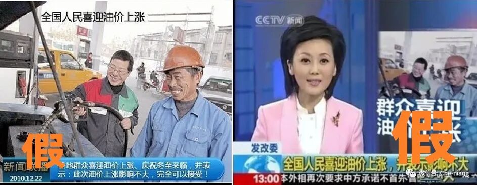 一款名叫“新闻相机”的App,只需要在手机上就可以为图片套用仿照各大电视台新闻节目的模板,假装这是电视台播出的新闻片段。一些著名的谣言图片例如“全国人民喜迎油价上涨”。
