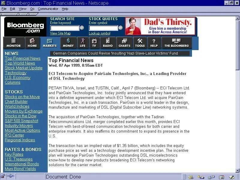 1999 年 4 月 8 日,SEC 和纳斯达克官员联合调查,某科技公司的一名工程师伪造了彭博(Bloomberg)官网一份虚假报告,称公司正被高价收购,使该公司股价迅速涨超 30%,成为当日纳斯达克最活跃股票第 12 名。