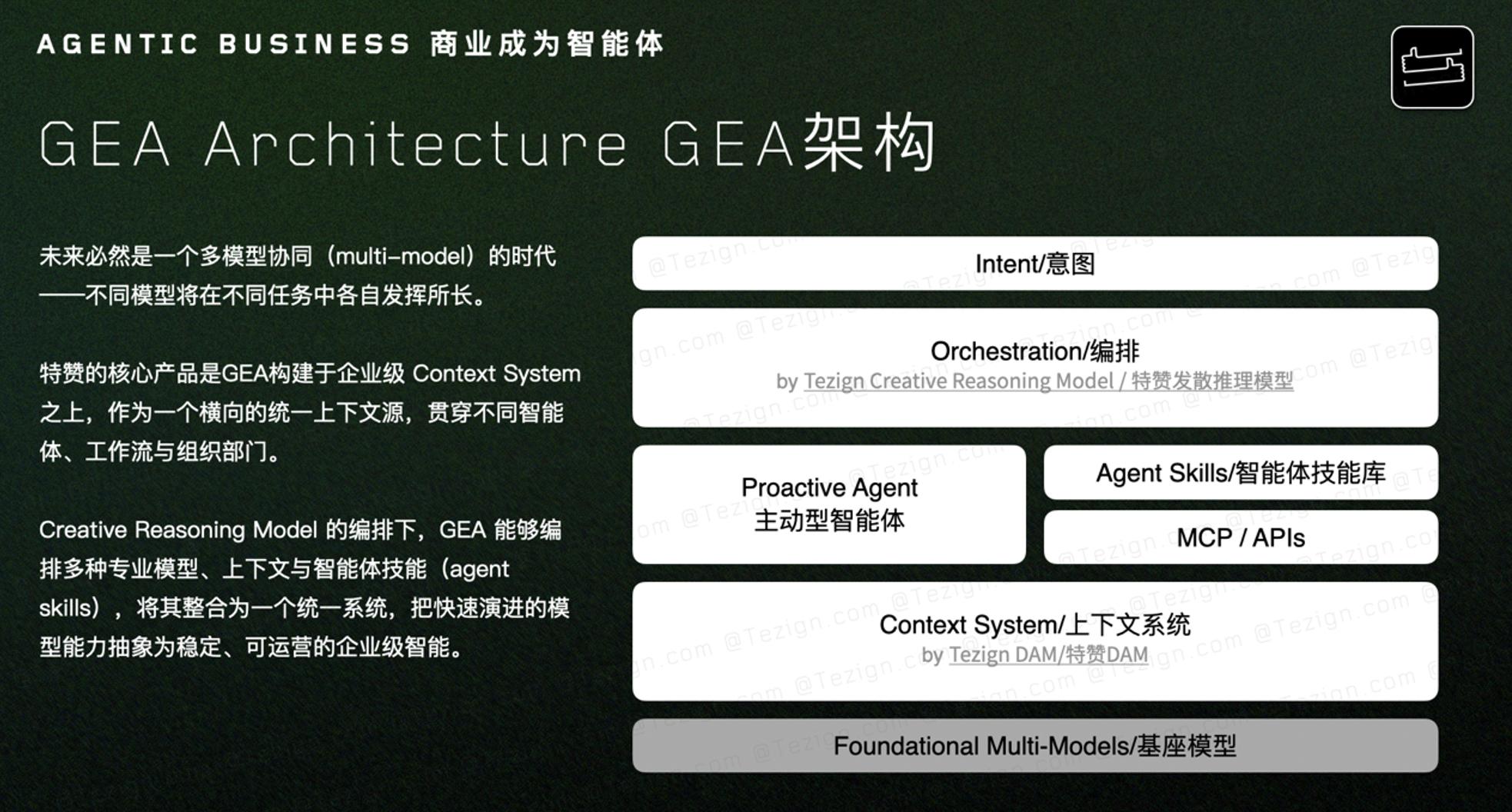 企业不再问“要不要用AI”,问的是“钱花了,为什么还没见效”。这正是应用端的机会。范凌表示,特赞推出的企业级智能体GEA(Generative Enterprise Agent),就是来解决这个问题的,不是简单的画图、做PPT,而是让AI真正参与企业的工作——理解目标,组织能力,并持续推动结果产生,从而向企业交付业务结果。