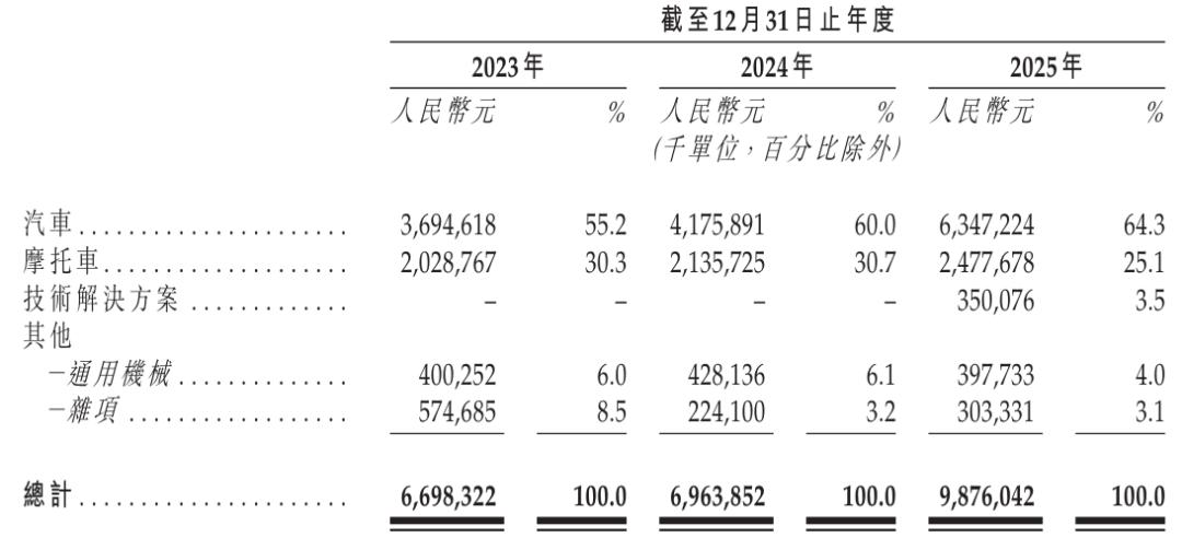 千里科技2025年汽车收入63.47亿,占比为64.3%;摩托车收入为24.78亿,占比为25.1%;来自技术解决方案收入为3.5亿元,占比为3.5%。