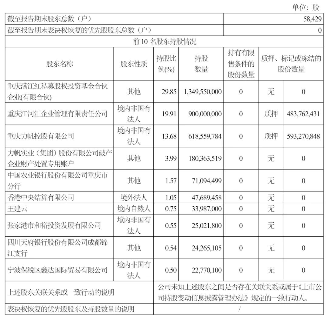 截至2025年12月31日,重庆满江红私募股权投资基金合伙企业(有限合伙)持股为29.85%,重庆江河汇企业管理有限责任公司持股为19.91%,重庆力帆控股有限公司持股为13.68%,力帆实业(集团)股份有限公司破产企业财产处置专用账户持股为3.72%;