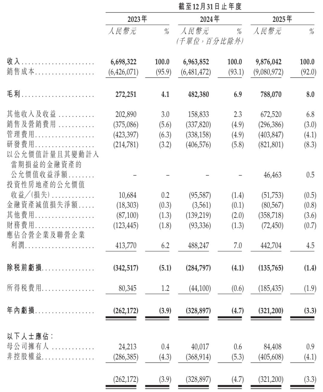 招股书显示,千里科技2023年、2024年、2025年营收分别为67亿、69.64亿、98.76亿元;毛利分别为2.72亿、4.82亿、7.88亿元;毛利率分别为4.1%、6.9%、8%。