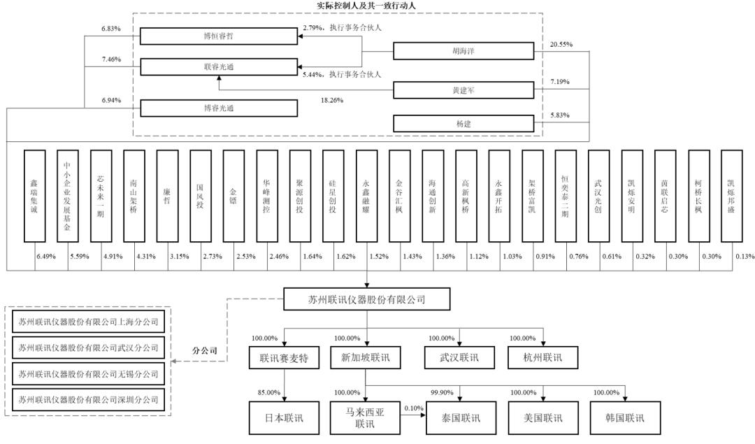 IPO前,胡海洋直接持有公司20.55%的股份,并通过其担任执行事务合伙人的员工持股平台联睿光通、博恒睿哲分别间接控制公司7.46%、6.83%的股份,合计控制公司34.83%的股份,系联讯仪器控股股东。