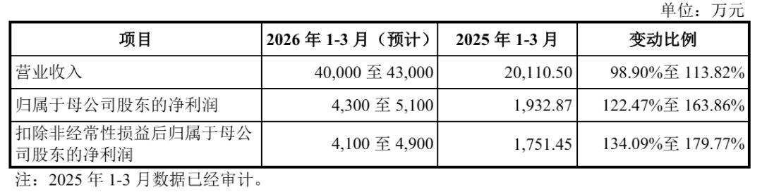 联讯仪器预计2026年第一季度营收为4亿到4.3亿元,较上年同期的2亿元增长98.90%至113.82%;预计净利为4300万到5100万,较上年同期的1933万元增长122.47%至163.86%;预计扣非后净利为4100万到4900万元,较上年同期的1751万元增长134.09%至179.77%。