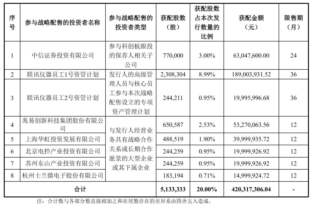 联讯仪器战略配售投资者分别为中信证券投资有限公司、联讯仪器员工1号资管计划、联讯仪器员工2号资管计划、兆易创新科技集团股份有限公司、上海华虹投资发展有限公司、北京电控产业投资有限公司、苏州东山产业投资有限公司、杭州士兰微电子股份有限公司,一共认购4.2亿元。