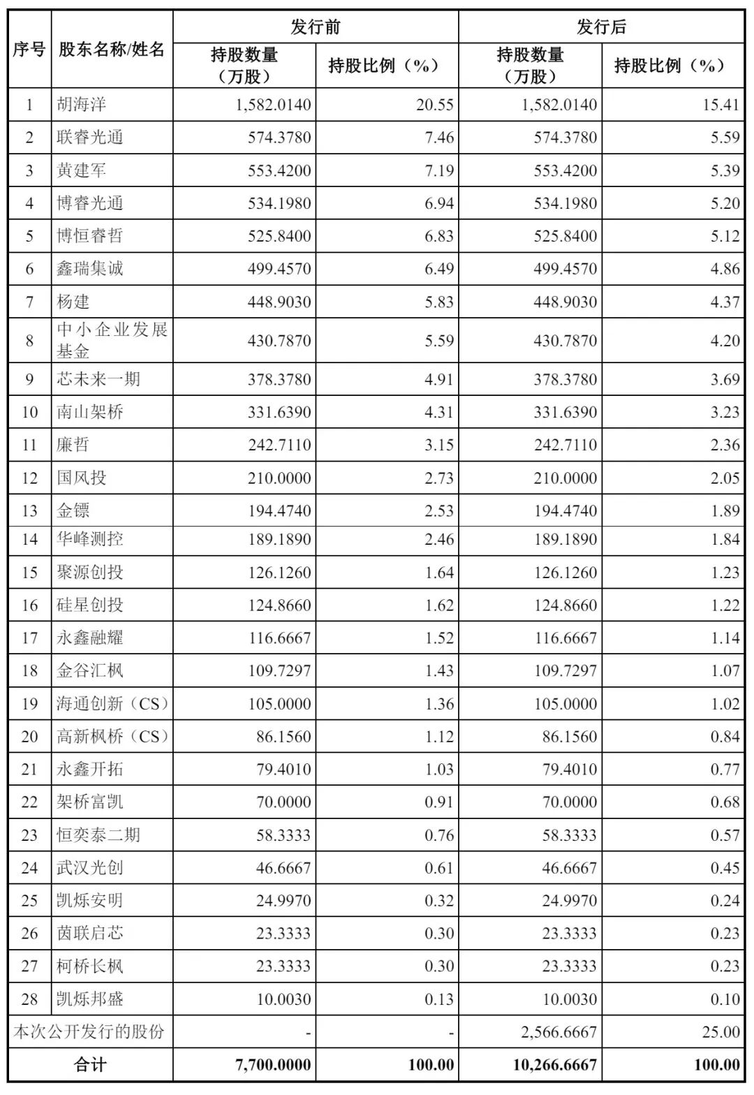 IPO后,胡海洋持股15.41%,联睿光通持股5.59%,黄建军持股5.39%,博睿光通持股5.2%,博恒睿哲持股5.12%,鑫瑞集诚持股为4.86%,杨建持股为4.37%,中小企业发展基金持股为4.2%,芯未来一期持股3.69%;