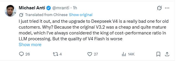 也有用户表达保留意见,X用户Michael Anti在试用后表示,V4 Flash的实际体验未能超越此前已相当成熟的V3.2,认为对老用户而言升级体验令人失望。