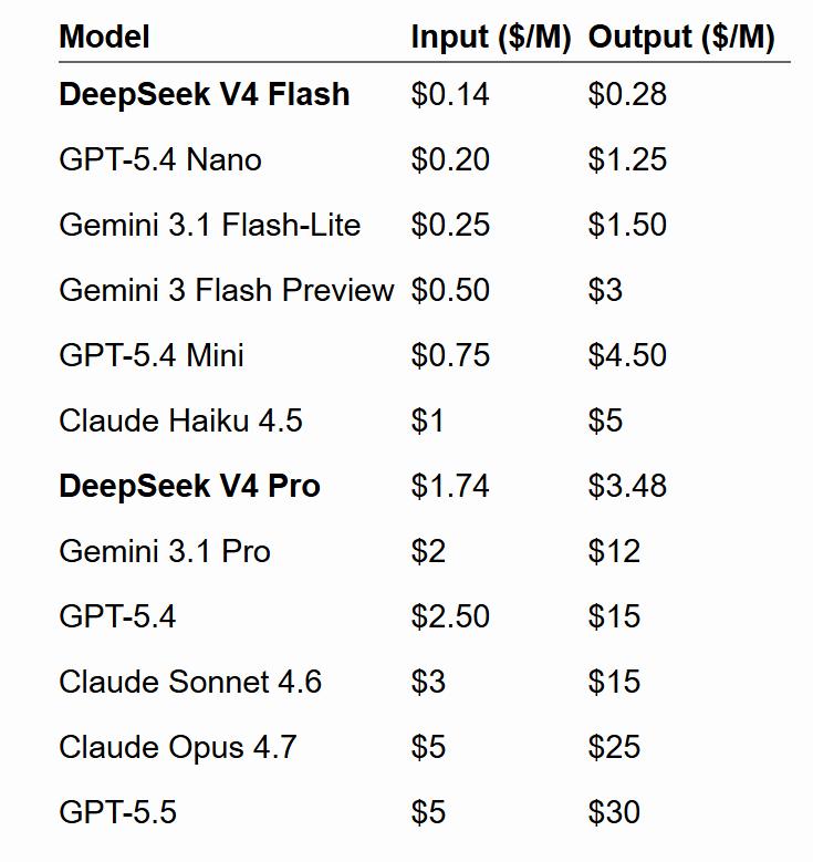 DeepSeek的定价策略是此次发布中最受市场关注的部分。V4-Flash的输入/输出价格分别为每百万token 0.14美元/0.28美元,低于OpenAI GPT-5.4 Nano(0.20美元/1.25美元)和Gemini 3.1 Flash-Lite(0.25美元/1.50美元),是目前小型模型中定价最低的选项。