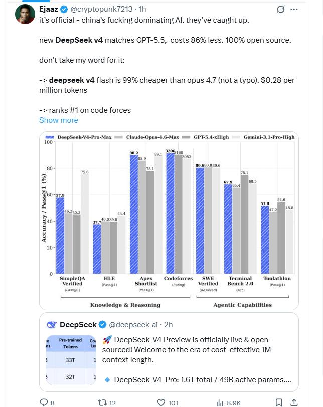 "中国正在主导AI,他们已经追上来了。DeepSeek V4 Flash比Opus 4.7便宜99%,每百万token仅需0.28美元,代码竞技场排名第一,这不是笔误。"