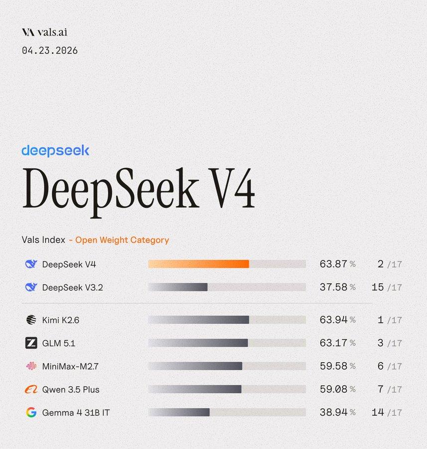 Vals AI特别强调,V4较V3.2实现了约10倍的性能跃升——"V3.2在该基准上仅得5分,这不是笔误。"在Vals综合指数排名中,V4以第2位收官,与榜首Kimi K2.6仅相差0.07%。