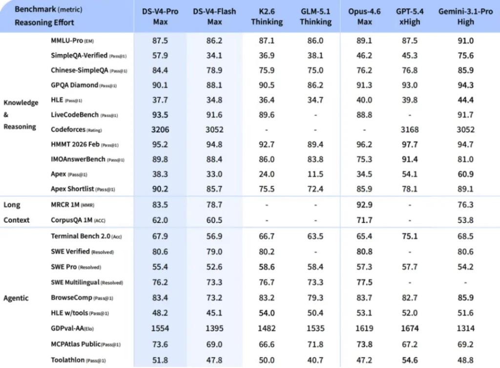 V4-Pro的输入/输出价格为1.74美元/3.48美元,同样低于Gemini 3.1 Pro(2美元/12美元)、GPT-5.4(2.50美元/15美元)、Claude Sonnet 4.6(3美元/15美元)和Claude Opus 4.7(5美元/25美元)。