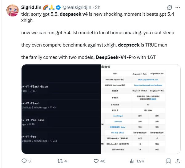 社区反应十分积极。在X平台上,用户Sigrid Jin称其带来新的“shocking moment”,并提到“现在可以在家里跑 gpt 5.4-ish 的模型”。他写道: