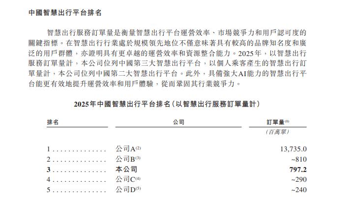 曾经依靠B2C模式所积攒的独特性也不复存在,T3出行的市场份额在2023年就被曹操出行反超。招股书显示,以智慧出行服务订单量计算,T3出行2025年在中国智慧出行平台中依旧排在第三位。