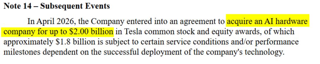 2026年4月23日深夜,特斯拉向SEC提交了一份季报文件。文件最后一页的注释里,用不到两行字披露了一笔交易:特斯拉同意以最高20亿美元收购一家AI硬件公司,全部以普通股和股权激励支付,其中约18亿美元取决于技术里程碑的达成。