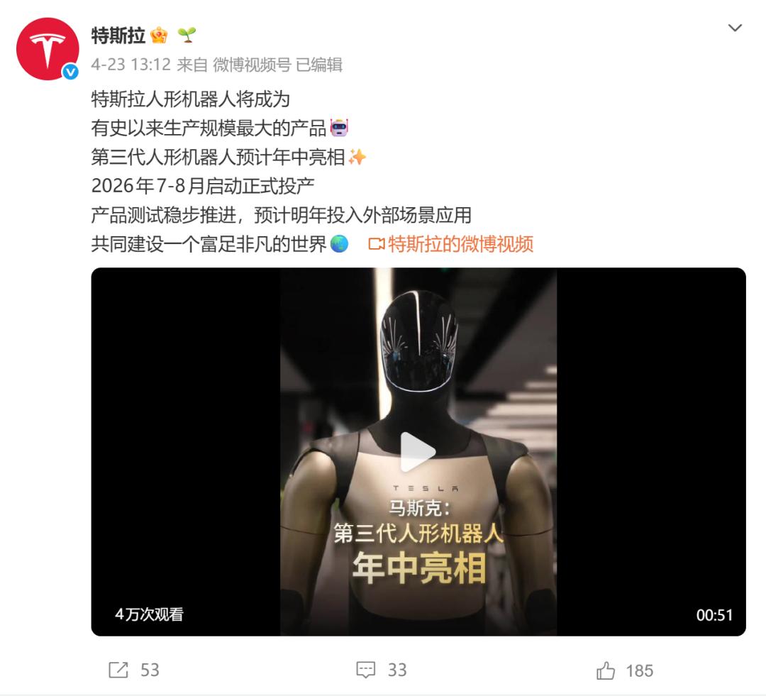 4月23日,特斯拉通过官方微博账号宣布:第三代Optimus(Gen3)预计将于年中正式亮相,并计划在2026年7至8月间在加州弗里蒙特工厂启动大规模生产,年产目标100万台。