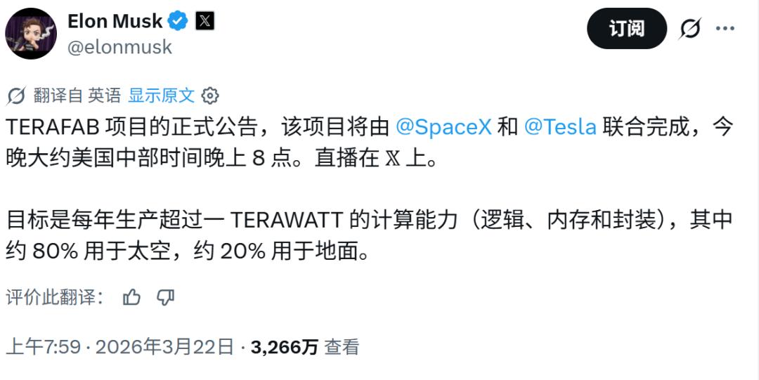 3月21日:马斯克宣布Terafab计划——由特斯拉、SpaceX、xAI联合,在德克萨斯州奥斯汀建造全球最大规模的芯片制造工厂,目标年产1太瓦(1TW)AI算力,是目前全球算力总产能的约一半。