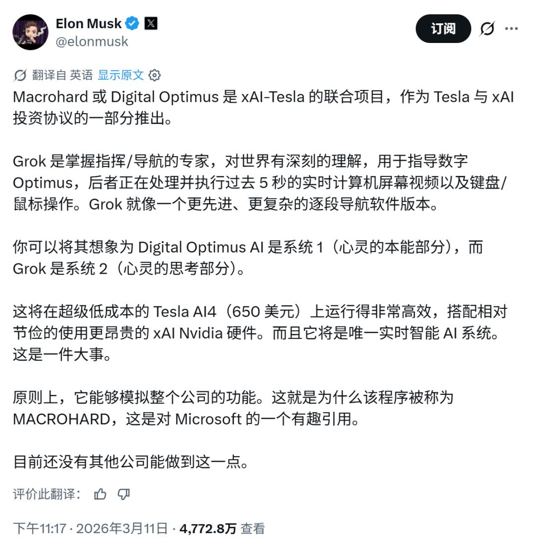 3月11日:马斯克确认,特斯拉与xAI的联合项目"Macrohard"(中文媒体译为"巨硬")正式进入全面推进阶段。该项目由特斯拉AI软件副总裁Ashok Elluswamy牵头,旨在用AI模拟一整家软件公司的完整职能——Grok担任高层决策者,特斯拉的AI代理负责实时操作屏幕、键盘和鼠标,执行具体的软件开发任务。