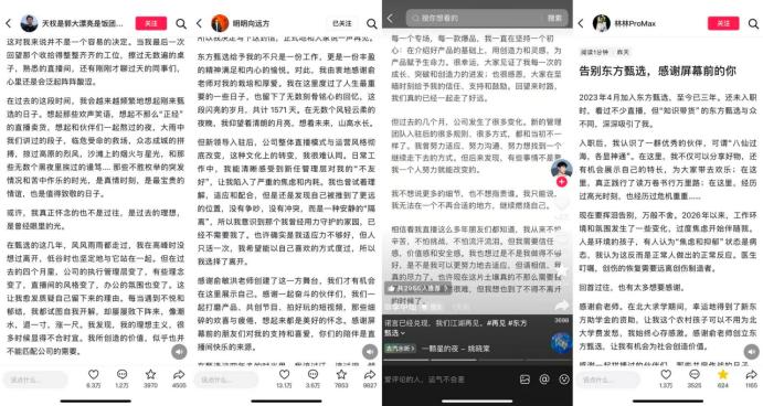 这四位离职的主播里,在东方甄选待得最久的是明明,当年和董宇辉一起出圈,最短的也在东方甄选工作了三年。可以说,他们既经历过东方甄选知识带货的火热时期,也亲历了当年的“小作文风波”。至于离职原因,他们都提到了过去几个月公司的变化。