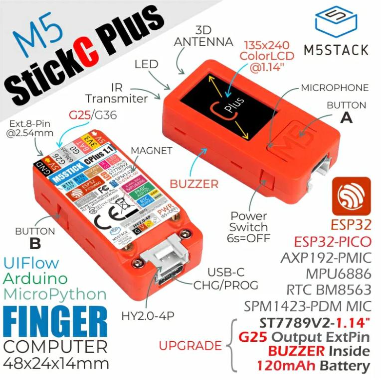 官方参考硬件是M5StickC Plus,来自深圳公司M5Stack(明栈科技);芯片用的是ESP32,来自上海乐鑫科技。