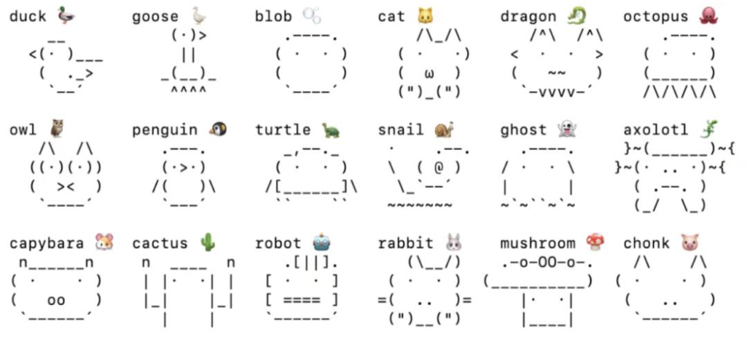 它内置了18种ASCII小动物形象,用的正是Claude Code此前源码泄露里的那一套宠物系统,每种都有完整动画: