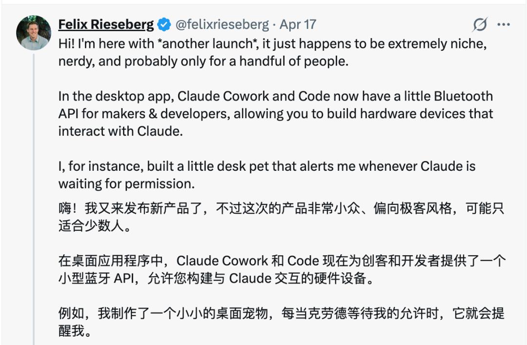 这是Anthropic工程师Felix Rieseberg发起的开源项目,名字叫Claude-Desktop-Buddy。