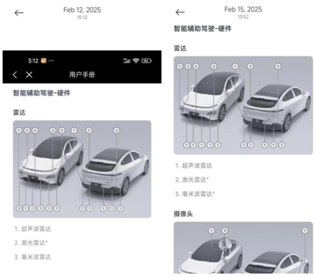 图/小鹏G6用户手册激光雷达数量前后对比 来源/互联网 新能源观截图