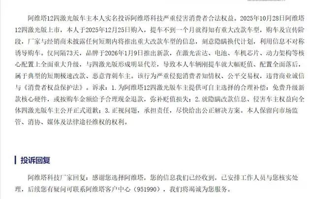 图/阿维塔12车主投诉 来源/互联网 新能源观截图