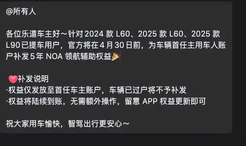海量老车主涌入社交平台和投诉渠道维权,乐道迫于压力紧急召开用户沟通会,最终拿出的补偿方案:免费赠送5年NOA高阶智驾使用权+免费OTA升级。