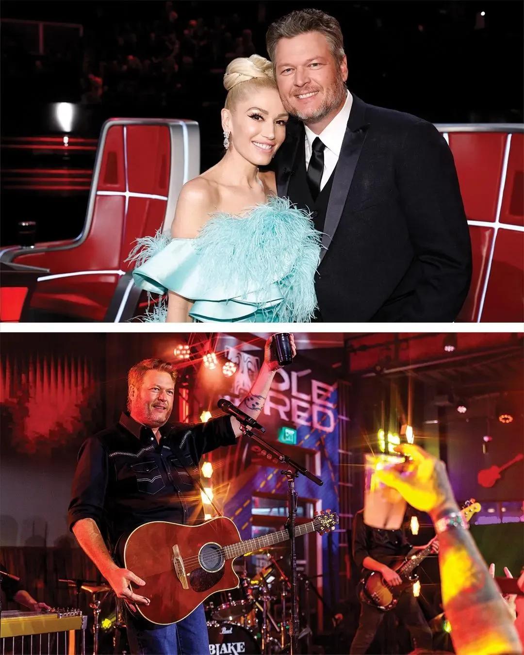 无处不欢乐:谢尔顿与妻子、流行歌手格温・史蒂芬妮相识于《美国之声》,他也是该节目史上夺冠次数最多的导师。此外,他还创办了Ole Red连锁餐厅,主打乡村音乐主题,在纳什维尔、拉斯维加斯等城市设有分店,提供现场音乐演出。图片来源:FROM TOP: BLAKE SHELTON AND GWEN STEFANI BY TRAE PATTON/NBC/GETTY IMAGES; BLAKE SHELTON BY CHRISTOPHER POLK/PENSKE MEDIA/GETTY IMAGES