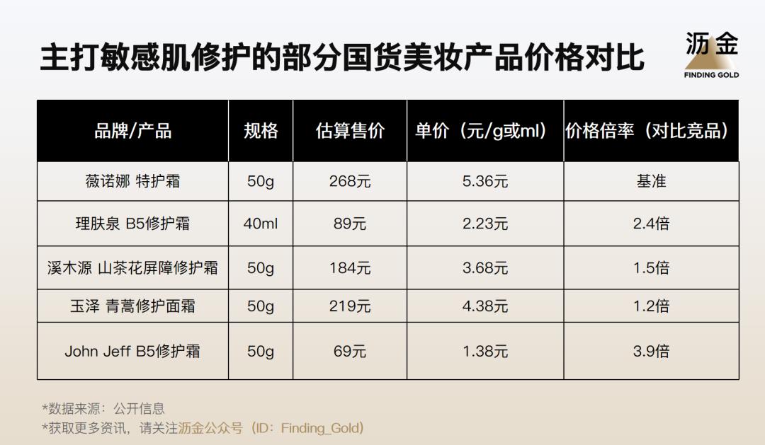对比竞争对手,理肤泉主打修护的B5修护霜40ml售价约89元,折合每克约2.23元;玉泽的青蒿修护面霜售价219元50g,折合每克约4.38元;John Jeff的B5修护霜,每克单价更是低到1.38元。