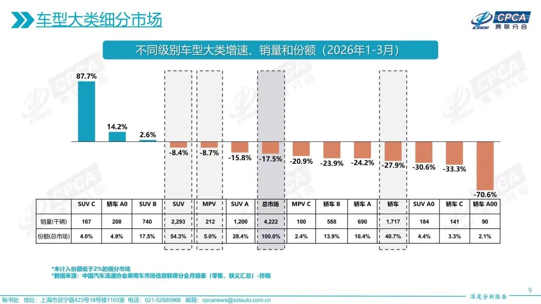 大型SUV的赛道上,挤满了自主品牌的9系车,它们有一定的共通性,即更大的尺寸、更强的科技、更高的智能化水平、以及更能打的价格。一方面,大型SUV市场展现了它的增长潜力,乘联分会数据显示,今年1-3月,C级SUV销量同比增长87.7%,这一增速领先大盘及其他所有细分市场。但另一方面,C级SUV一季度总销量仅16.7万辆,市场份额仅4%。在一个月销约5万辆的赛道,骤然涌进十数款新品,共同做大市场蛋糕的同时,竞争的激烈程度也将升维。