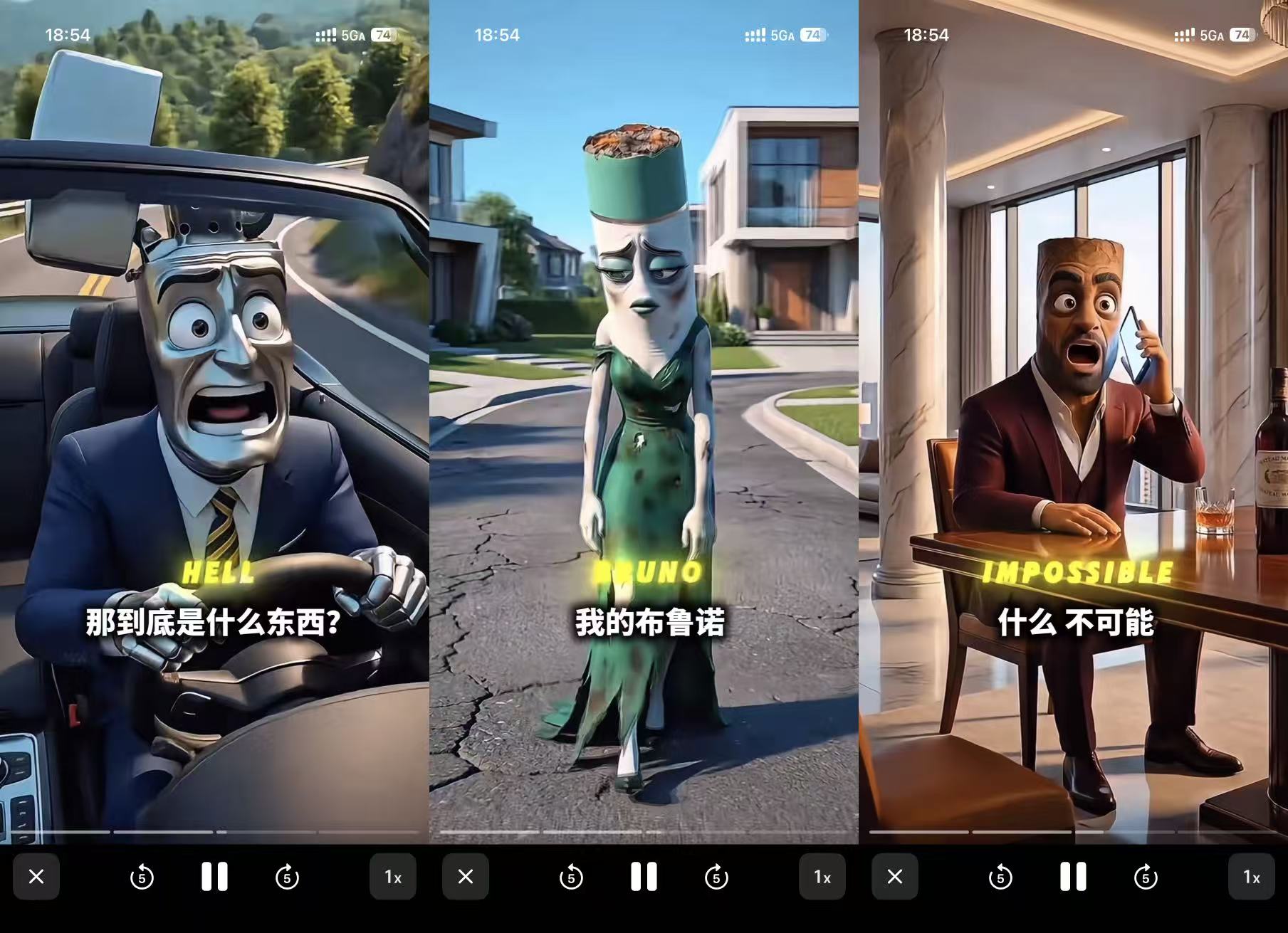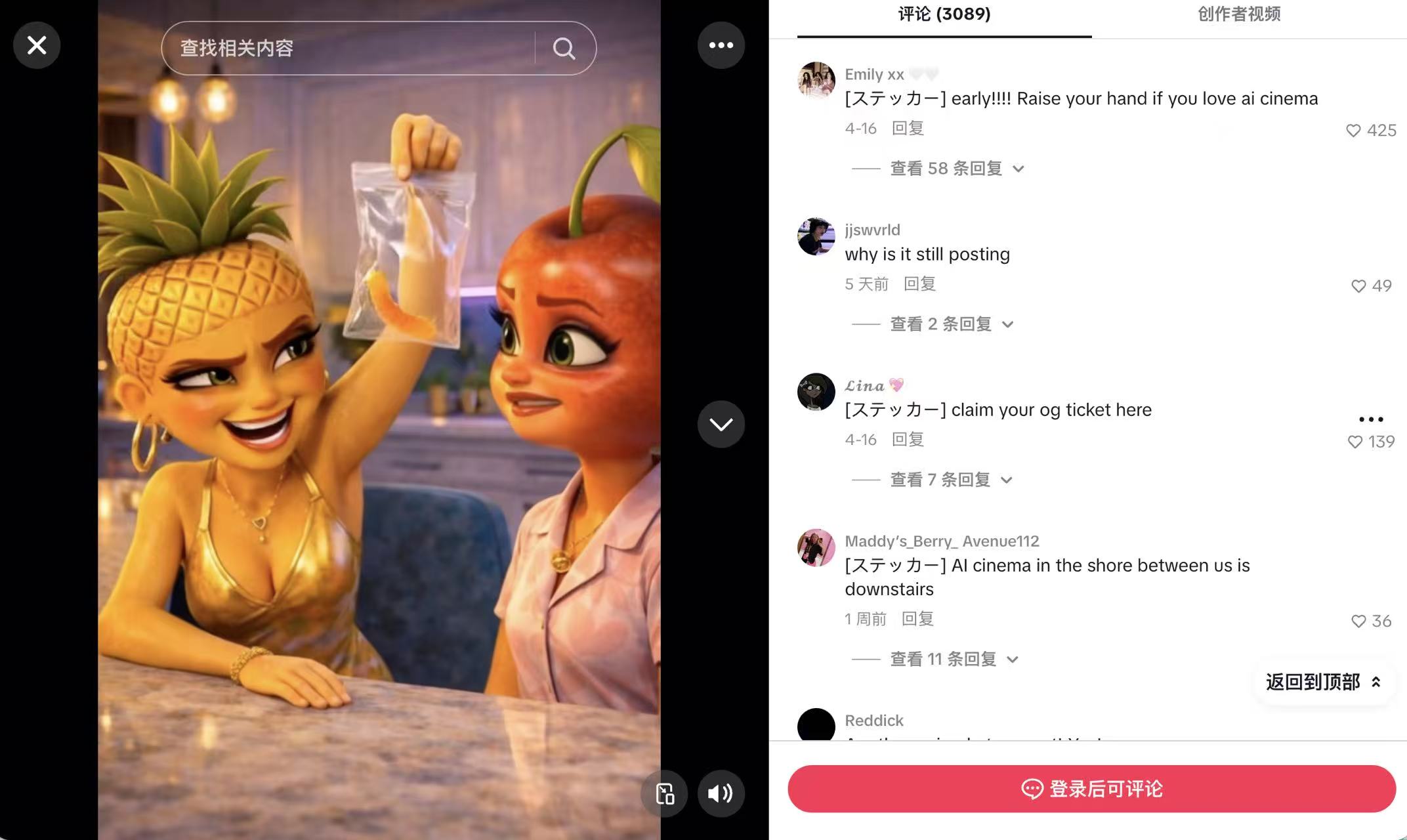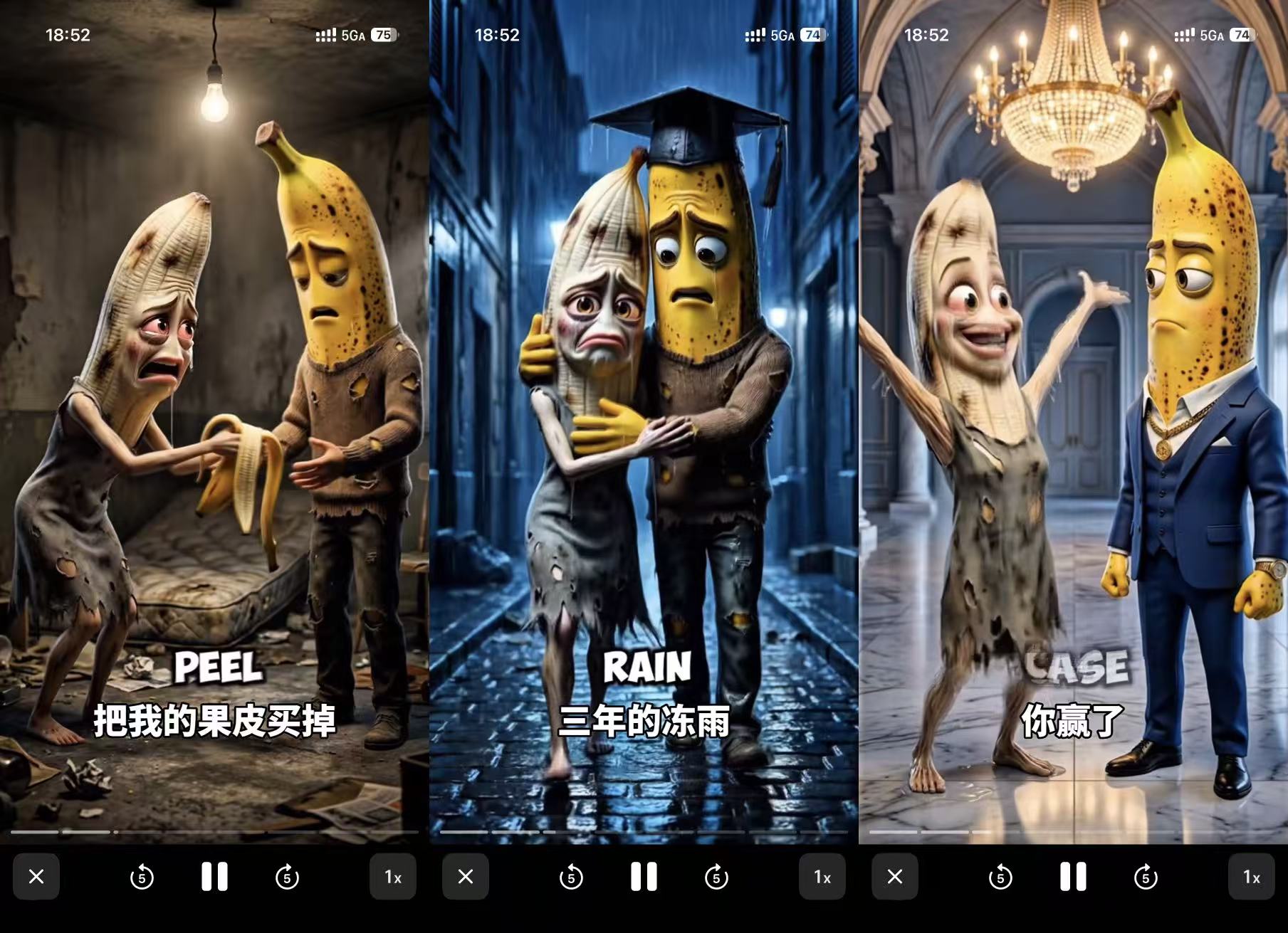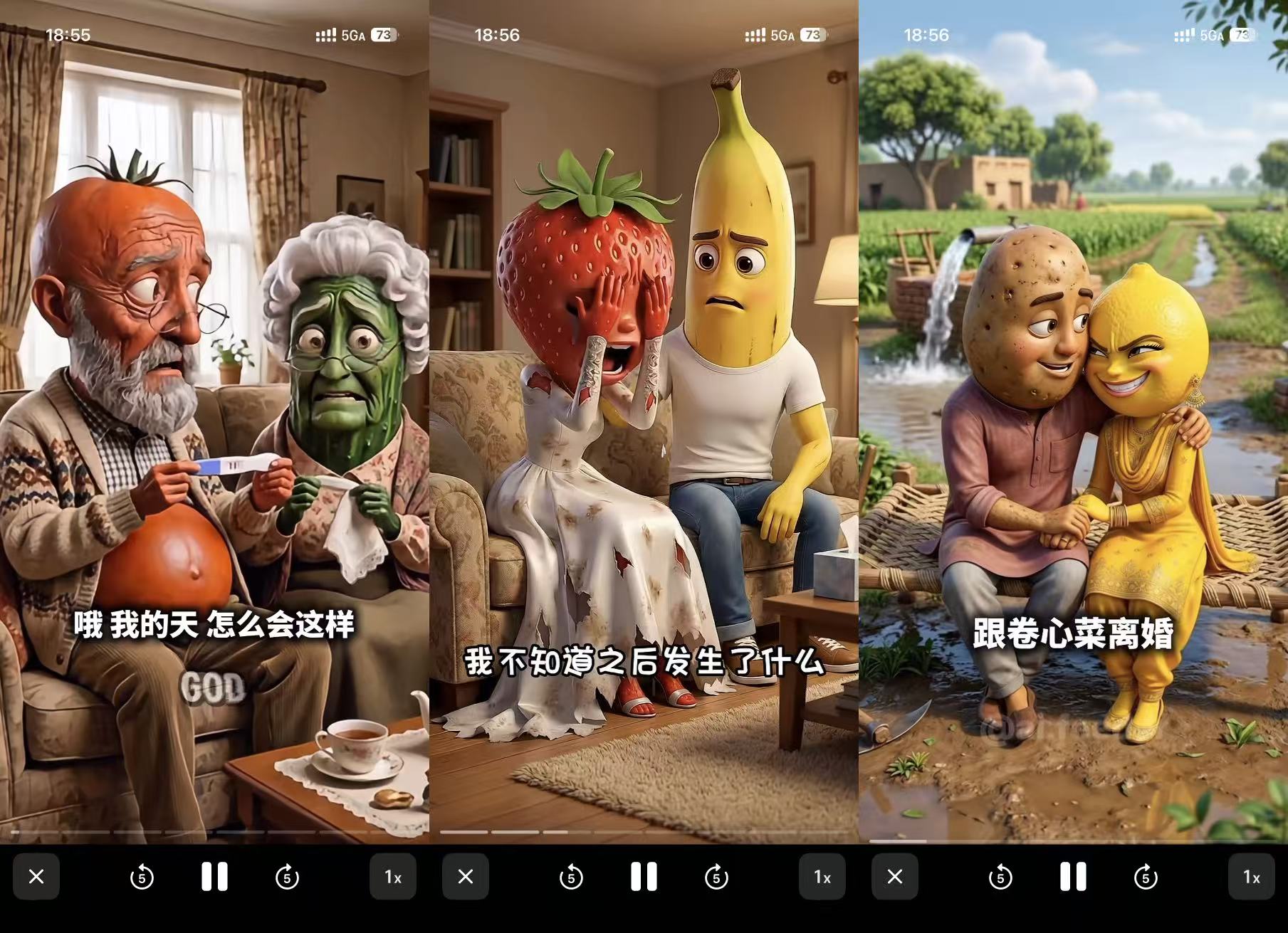 所以当香蕉的手突然多出来第三只,或者草莓的脸突然贴歪了,观众的反应完全不会觉得这很奇怪,而是「这好好笑」,AI 生成的瑕疵,在水果短剧里都自动变成了加分项,大家也不会认真地去看,只觉得好笑。