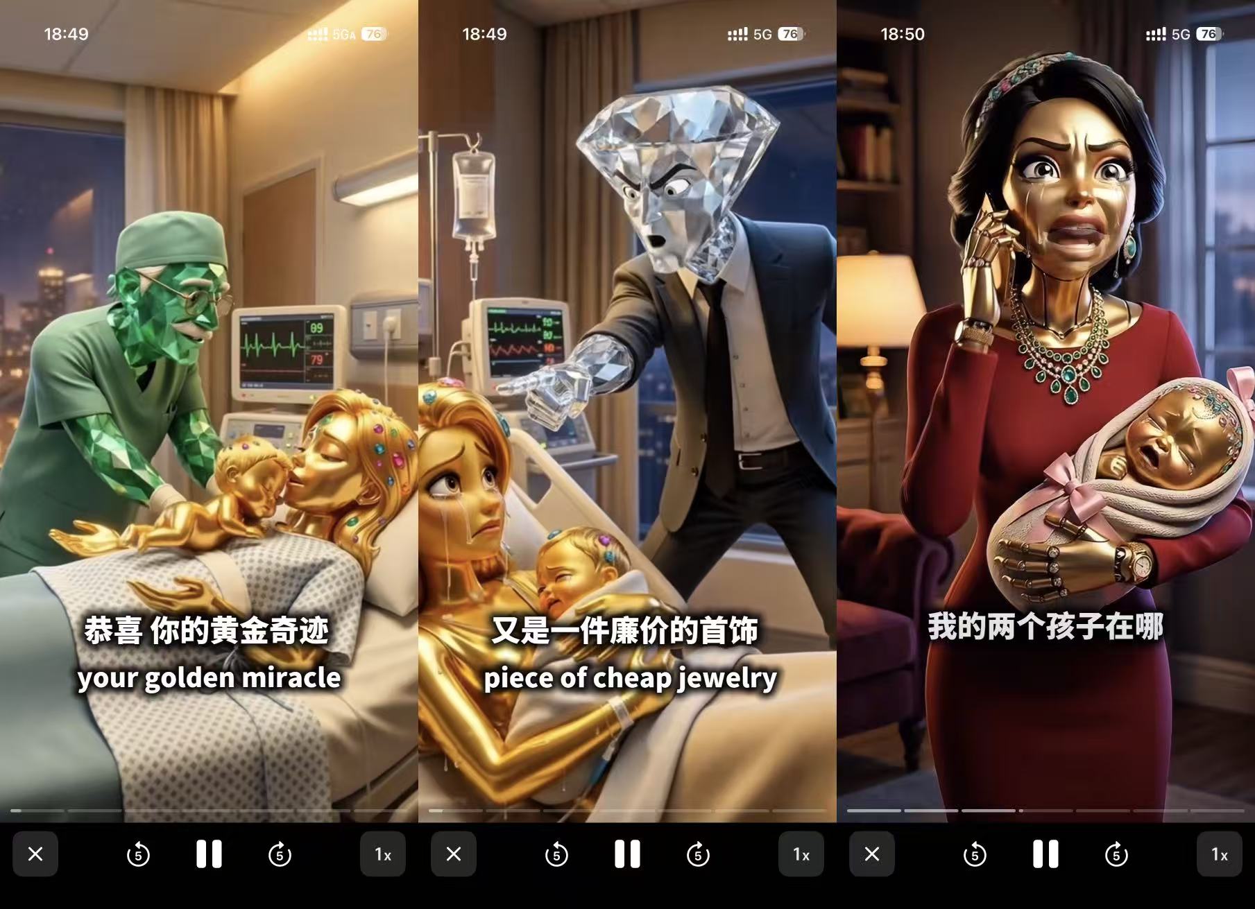 其实,大家也很清楚,这些 AI 没有任何能够夸赞的点,甚至有些浪费算力,但就是让人忍不住点进去看完一集又一集,这些爽点爆炸的剧情,实际上也早就在前两年真人短剧爆火时期被验证过了,只是换成水果们,再演一遍。