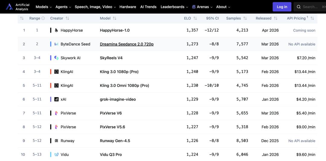4月7日,Artificial Analysis Video Arena排行榜上悄然出现了一个匿名模型。没有公司背书,没有任何官方说明,它就这样安静登顶——然后以约60个Elo分的优势,在文生视频和图生视频两个赛道同时压过Seedance 2.0,把可灵3.0、Sora 2 Pro乃至Google Veo 3.1全部甩在身后。