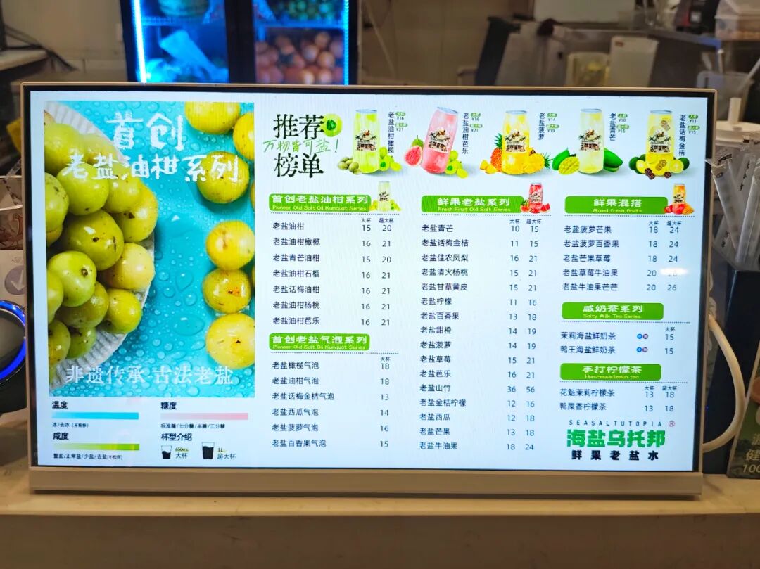 以“巨人老盐水”为例,菜单以老盐鲜果汁为核心,产品线涵盖老盐菠萝、老盐西瓜、老盐柠檬等经典款,更结合两广特色推出了老盐青芒、老盐油柑青橄、老盐清甘杨桃等差异化单品,单杯售价集中在9.9~18元。