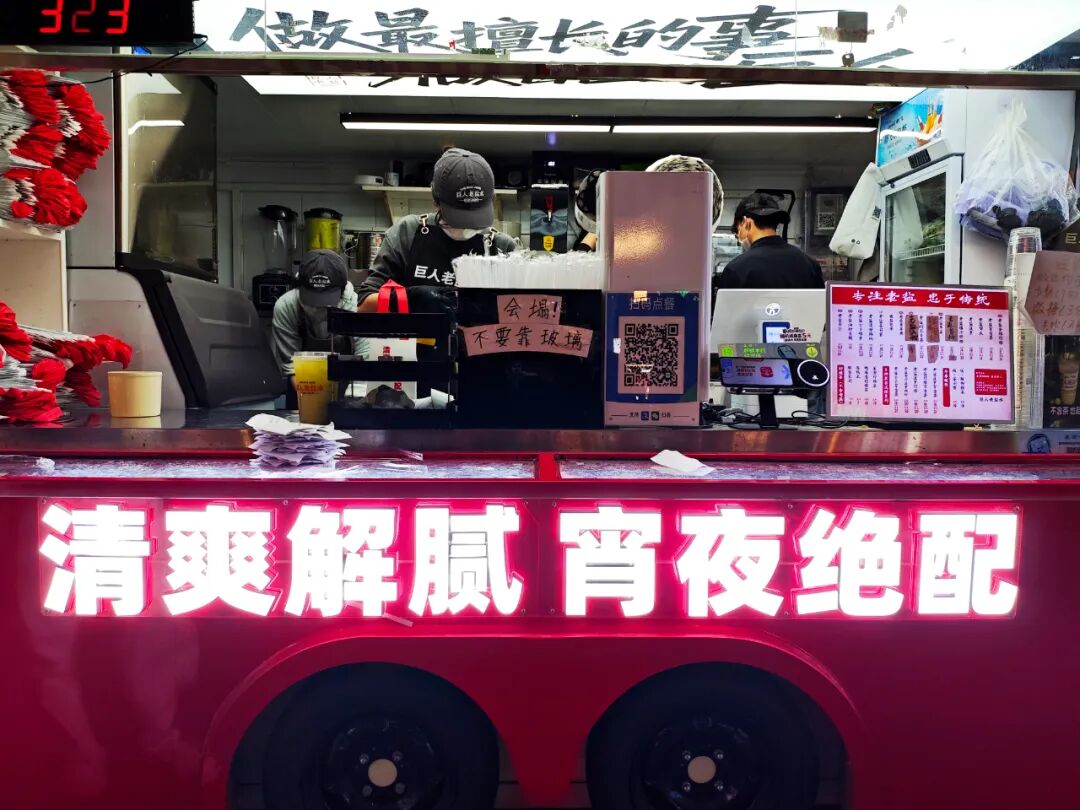 我在店内观察了一会儿,外卖单多来自周边的烧烤店、夜市大排档,深度绑定夜宵场景。有网友分享,高峰期排队1小时是常态,“来旅游,上火车前都要带一杯走。”