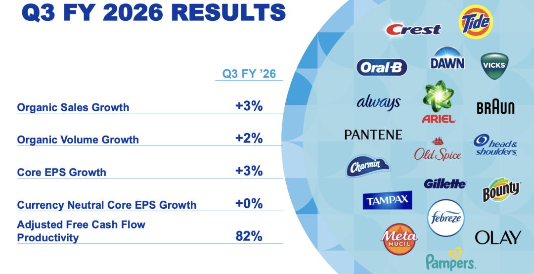 2026财年第三季度,宝洁净销售额为212亿美元,同比增长7%;有机销售增长3%,其中销量贡献2个百分点,价格贡献1个百分点。核心每股收益为1.59美元,同比增长3%。