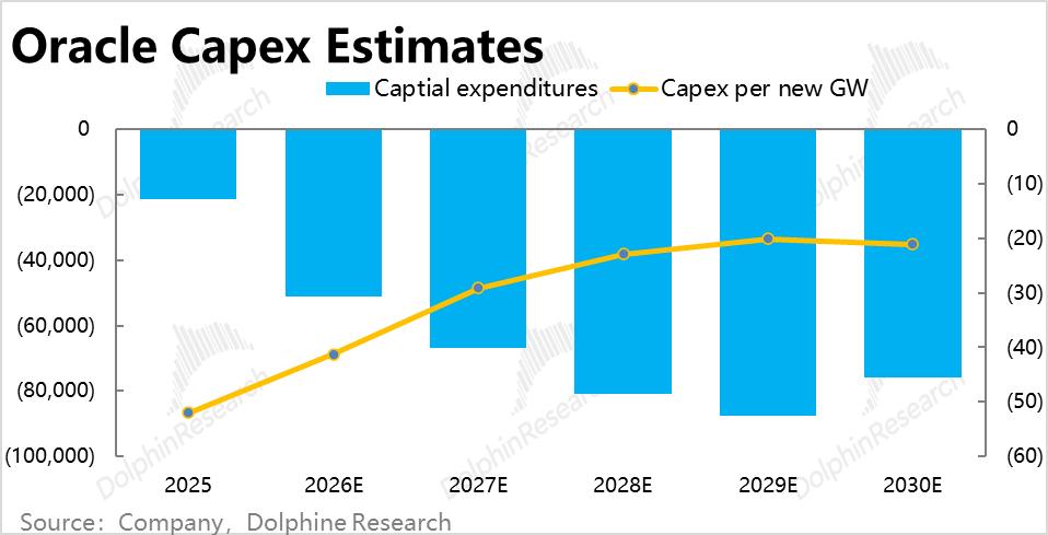 而根据Oracle近期表示的“在与部分客户的合作项目中,会依赖于用户的预付款来购买设备,或者直接由客户购买好GPU再提供给Oracle”,海豚君认为后续Oracle对每新增GW的实际Capex投入很可能会比此前的指引更低些,在我们的预测中假设为200亿每GW。