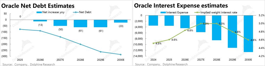 再结合Oracle历史上的平均负债利率和市场预期,假设Oracle的平均负债利率成本在4.6%~5%之间波动,因而到30财年Oracle的利息支出将达到峰值约$110亿,占当年收入的5%。