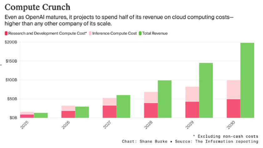 首先根据Information在25年底的预测,OpenAI到2030年目标实现$2000亿年营收,同时总算力支出达到约$1000亿,其中推理和训练支出大约各占50%。以此为参考,Oracle目前和OpenAI签订的合同(年600亿)实际已占据OpenAI到30年算力总支出的约60%。