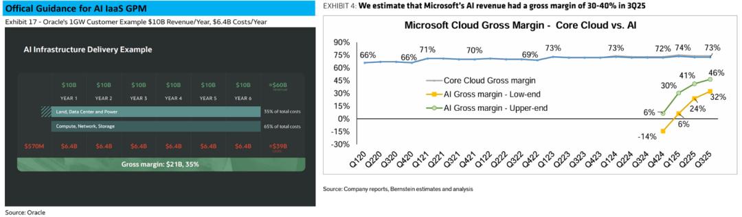 那么这个指引是否合理并可信?采取横向比对的方式:a. 业务构成和成本结构与Oracle的AI算力业务非常相似的CoreWeave,其稳态毛利率据我们此前测算大约在25%左右;b. 而据Berstein的预测微软在自然年3Q25季度内的AI云收入毛利率则大约在30%~40%左右。