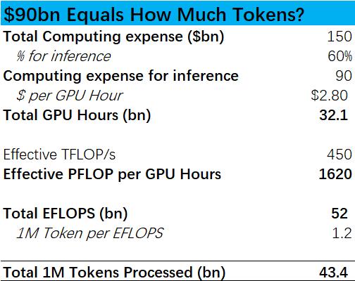经过一些换算后,$900亿推理支出大约可对应4000~4500亿的百万Tokens输出(详细过程可间下表,由于涉及很多假设,仅做量级上的参考)。参考市场内采用的假设,按轻度用户没每年消耗10个百万Tokens,则可支持全球40亿的轻度用户使用;按重度用户(如Agent使用者)每年消耗500个百万Tokens,则仅可供800多万用户使用。