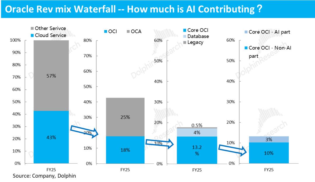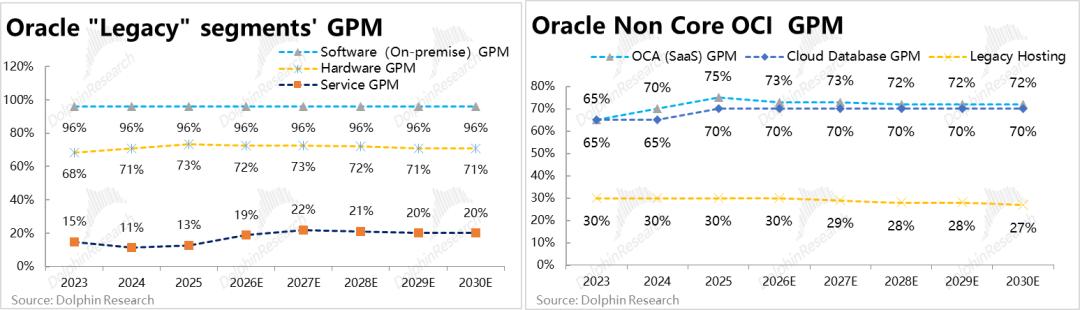 在最终的测算上,按照海豚君开篇定下的框架。我们分为两个部分进行测算,一是除AI算力租赁外的所有业务,包括三个遗老业务,OCA SaaS业务和OCI板块非AI算力租赁的部分;另一部分就仅包括AI算力租赁业务。