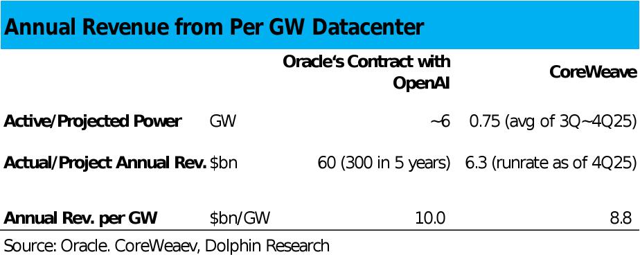 根据Oracle管理层,1GW规模的数据中心创造的年收入大约在$100亿左右。这一数据有两个实例验证:首先是OpenAI和Oracle的合同,5年3000亿涉及大约6GW算力,对应每GW年收入100亿。此外,CoreWeave在25年4季度的收入年化后$63亿,除4Q期间平均上线算力规模0.75GW,则每GW约产生收入$88亿。